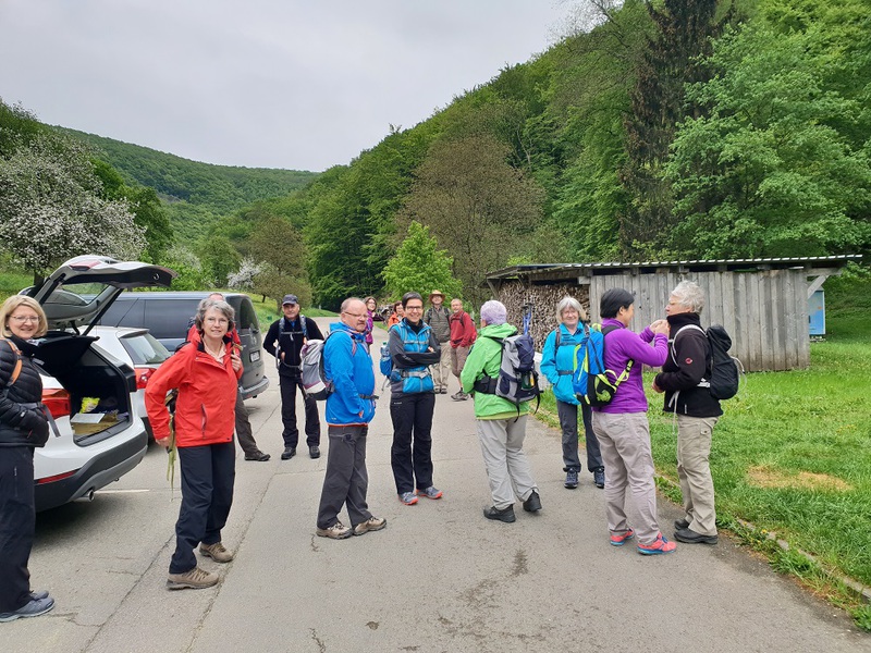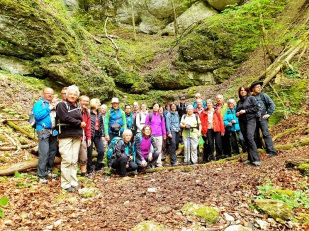 Die ersten Felsen wurden sichtbar und schon bald stand man vor einer eindrucksvollen Felsmauer am Ende der Schlucht, die „Große Schrecke“. Rechts schlängelte sich ein schmaler, steiler Pfad empor, der seine Tücken hatte und nicht ohne war. Oben angekommen wurde der Weg wieder flacher und breiter. Zur Freude aller blitzte ab und an die Sonne zwischen den Wolken hin durch. In Strohweiler suchten sich die Wanderer eine Rastgelegenheit und ließen sich ihr Rucksackvesper schmecken.