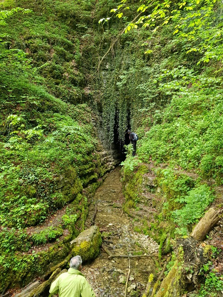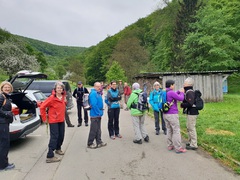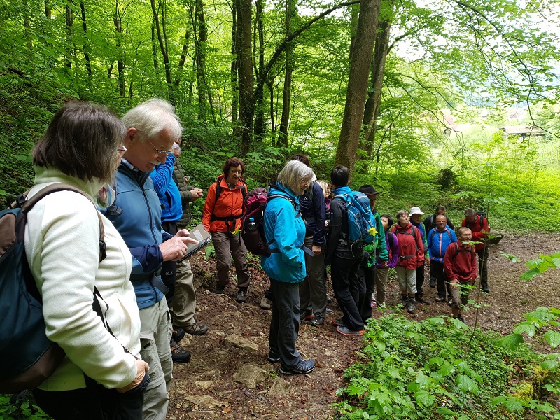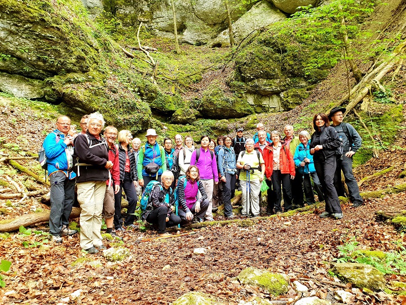 Die Wetterprognose hätte besser sein können, wovon sich aber 27 Wanderer nicht aufhalten ließen. Frohen Mutes machten sie sich auf, die wilde Landschaft auf der Lenninger Alb zu entdecken. Vom Parkplatz in Schlattstall machte die Wandergruppe einen kurzen Abstecher zum Goldloch, einer aktiven Wasserhöhle. Nun ging es weiter, ein breiter Weg führte entlang an bunt blühenden Blumenwiesen in den Wald, immer enger wurde das Tal.
