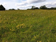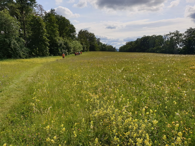 An der Hanneshöhle rechts vorbei, einen kurzen knackigen steil abfallenden Weg hinunter. Den Wackerstein umliefen wir in Gespräche vertieft in großem Bogen. Der Wannenweg führte uns mit seinen Kehren und Schleifen bis hoch hinauf auf die Schönbergwiese, die sich in ihrer vollen blühenden Pracht zeigte. Ein umgestürzter Baum lag über unserem Weg, wir bereiteten uns schon auf eine kleine Kletterpartie vor, aber schlaue Wanderer hatten uns schon eine Umgehungsalternative gebahnt.