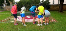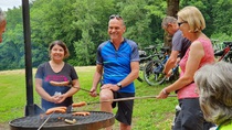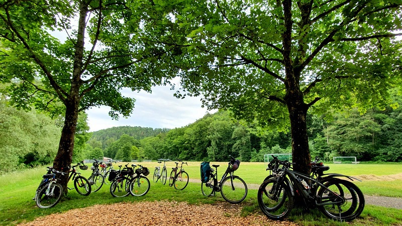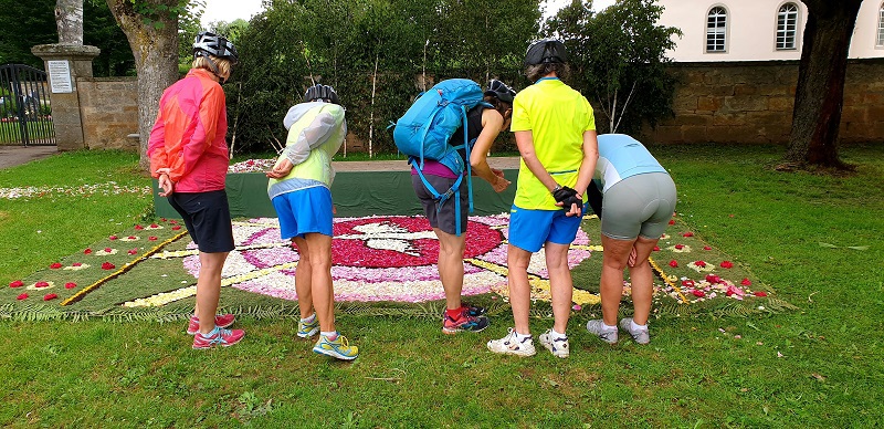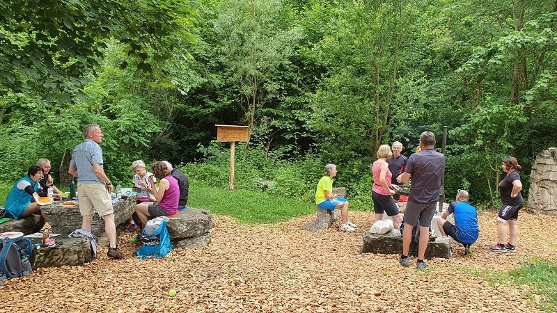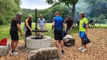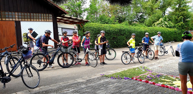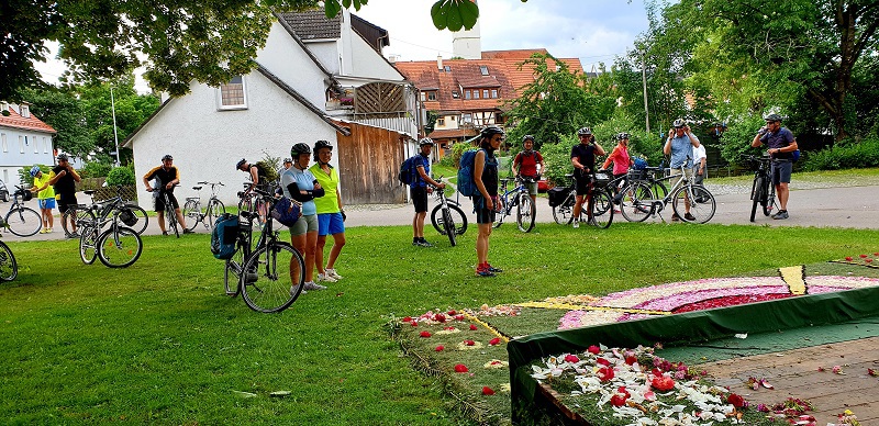 Mit Grillgut und Regenjacke im Gepäck fuhren wir über Bodelshausen zur Grillstelle im wunderschönen Katzenbachtal. Trockenes Feuerholz war auf wundersame Weise schon vor Ort. An der Römerquelle die Trinkflaschen aufgefüllt und weiter gings nach Rottenburg ein Eis essen. Mehrere liebevoll gelegte Blütenteppiche erinnerten uns daran, dass heute Fronleichnam gefeiert wurde. Über Bühl ging es zurück und bei einer stärkenden Einkehr im Dusslinger Schützenhaus ließen wir diese tolle Tour ausklingen.