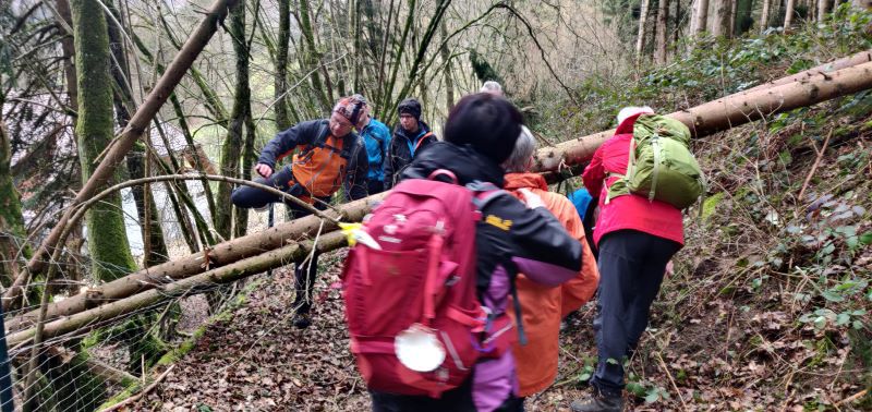Zum zweiten Mal luden Lauftreff und Albverein zur gemeinsamen Winter-Genießertour ein. Nach einer Stunde Fahrt war der Ausgangspunkt im Spätengarten erreicht. Die 3-Täler-Runde sollte uns die Täler von Glatt, Neckar und Langentalbach näher bringen. Von wegen Täler, erst ging es steil bergauf und über Fichten, die von den vergangenen Stürmen gefällt wurden. Das brachte etwas Abenteuer ins Genießertum. Außerdem war da noch jede Menge altertümlicher Müll im Wald. Nämlich mindestens 75 Jahre alte Alufolie, die von Bombern der Alliierten vor dem Angriff abgeworfen wurden, um die deutschen Radarsysteme zu täuschen. Unglaublich, dass diese Düperfolien immer noch im Wald verstreut liegen.