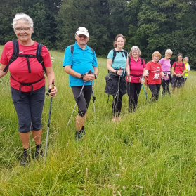 Am Samstag,den 17.07.2021, trafen sich 9 Walker um erwartungsvoll und gespannt das nicht bekannte Ziel "Burgholzteich" zu erkunden. Ausgangspunkt war der Friedhof in Stockach, lustig klangen unsere Walkingstöcke auf dem kurzen Weg der Hauptstraße, dann steil abwärts die Roggenstrasse hinunter. Nun auf Naturwegen über die Brücke des Ehrenbaches. Baumstämme und verschiedenartige Holzstücke lagen, durch das Hochwasser der vergangenen Tage verursacht, zusammengedrückt an den Rändern des sonst friedlichen Gewässers.
