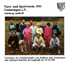 Bereits seit 1985 trifft sich in Gomaringen eine Gruppe zum gemeinsamen Joggen. Dietmar Klett war es, der als Mitglied des TSV Gomaringen die Initiative ergriff, Gleichgesinnte für das wöchentliche, gemeinsame Joggen zu finden. Dies war die Geburtsstunde des Lauftreffs. Beim WLSB wurde diese Gruppe als Leichtathletikabteilung des TSV mit Beginn 12.10.1985 angemeldet. Allerdings war die Zuordnung dieser Gruppe beim TSV offiziell nie so richtig klar, denn als ausgewiesene Abteilung oder als sonstige Organisation wurde der Lauftreff dort nie erwähnt. Manfred Drößler, der relativ früh mit von der Partie war und sich immer stark für die Fortentwicklung des Lauftreffs engagiert hatte, übernahm 1993 die Leitung dieser bereits recht stark angewachsenen Gruppe. Ein Jahr später, im April 1994, wurde neben dem Joggen noch das Walken angeboten.